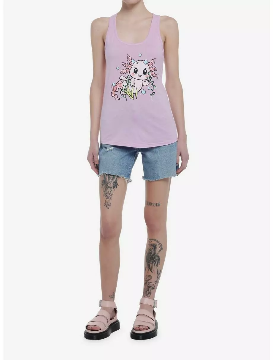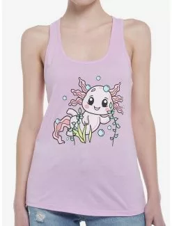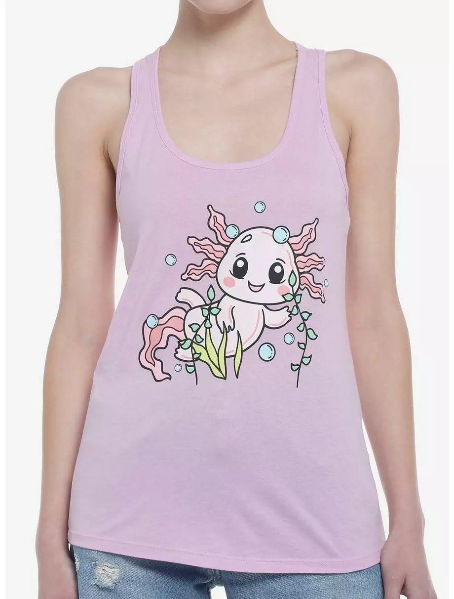 Need something light and breezy for your wardrobe? You’ll love this tank top a-lotl! Your favorite amphibian, the axolotl, is printed front and center on this racerback tank, swimming through bubbles and underwater plants.