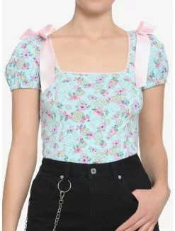 For a spring steampunk vibe, try this cute top. It puts a twist on your traditional florals and adds in clocks, gears and keys to the print. Features satin ribbons on the shoulders, a square neckline, puff sleeves, princess seams and just the right amount of stretch.