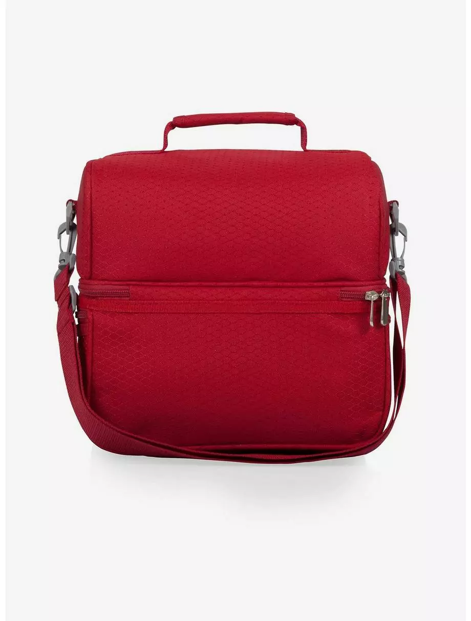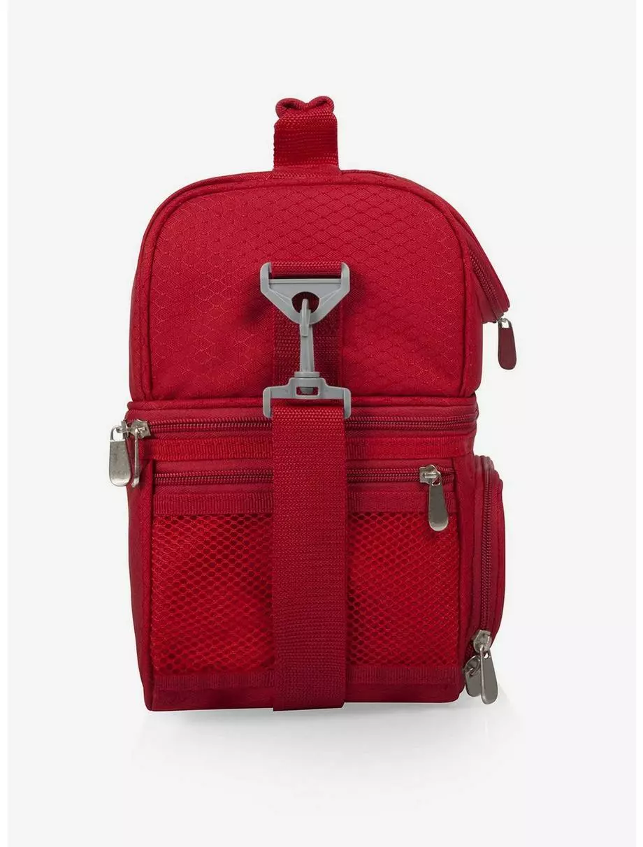 An insulated lunch cooler is perfect for a meal on the go. Features durable polyester construction with isolated sections for hot and cold foods and Mickey artwork on the front. Adjustable shoulder strap and soft grip handle offer transport options; Zippered mesh pockets on the sides for extras.
