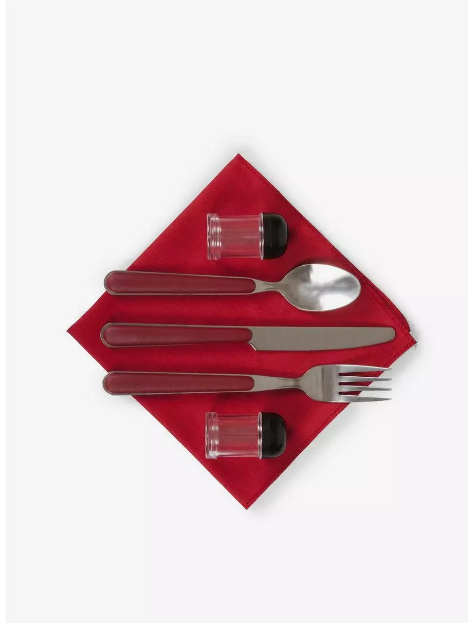 Includes: stainless knife, fork and spoon, plus S&P shakers, and coordinating cotton napkin in the zippered front pocket.