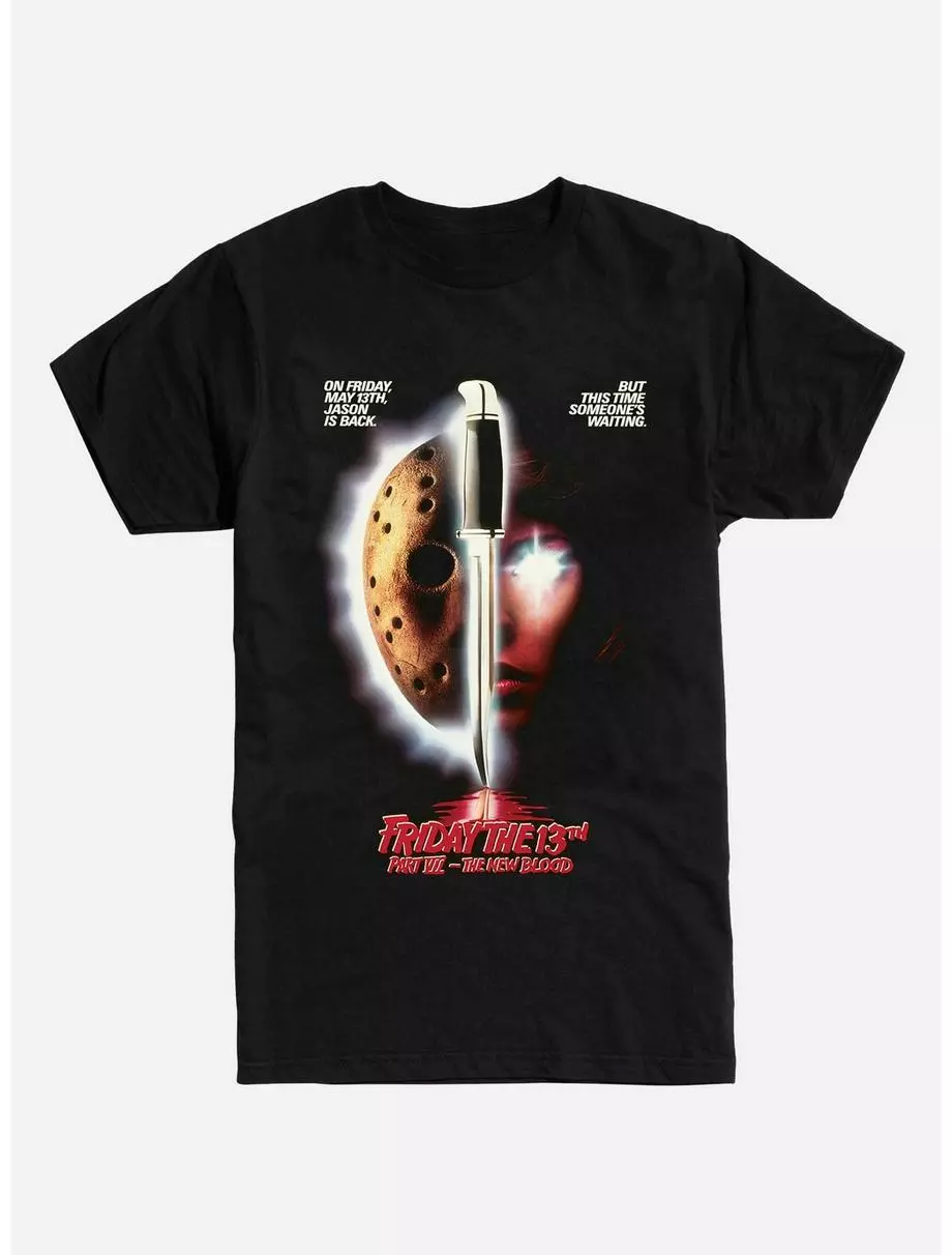 Who isn’t waiting for Jason Voorhees?! This lightweight black graphic tee features poster art from Friday the 13th Part VII — The New Blood.