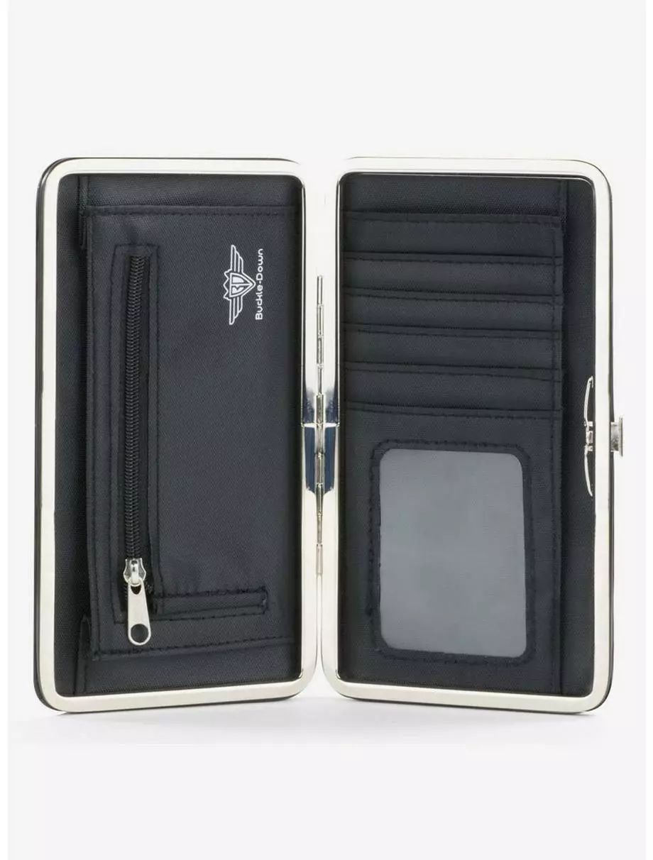 Stylish and sleek, this hinged wallet is made from vegan leather and stainless steel. It measures 7 x 4 x 0.75 inches, with 2 billfolds, 4 card slots, and a windowed ID holder.