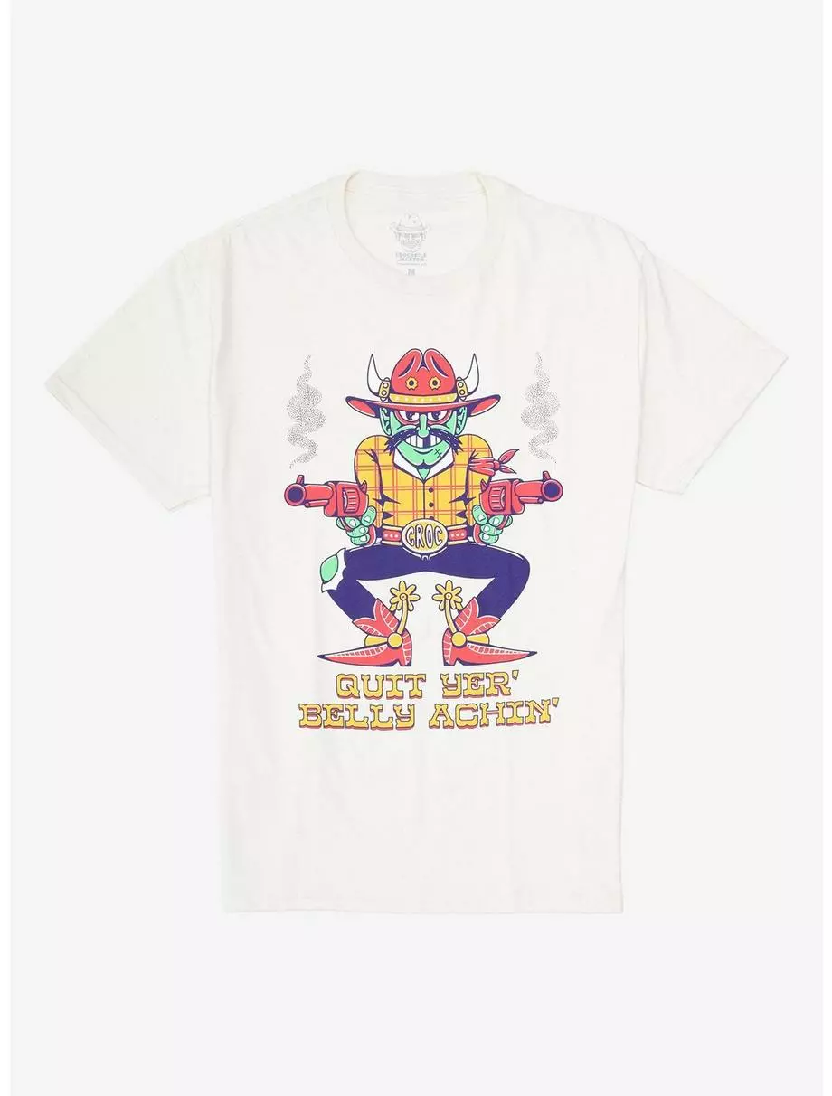 Tired of hearing people complain? Tell them to “Quit yer’ belly achin'” with this cream tee! Printed with a colorful dual-wielding cowboy and the quote below.