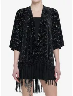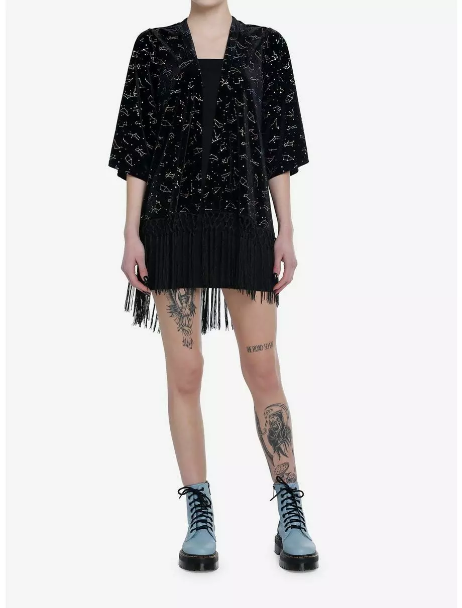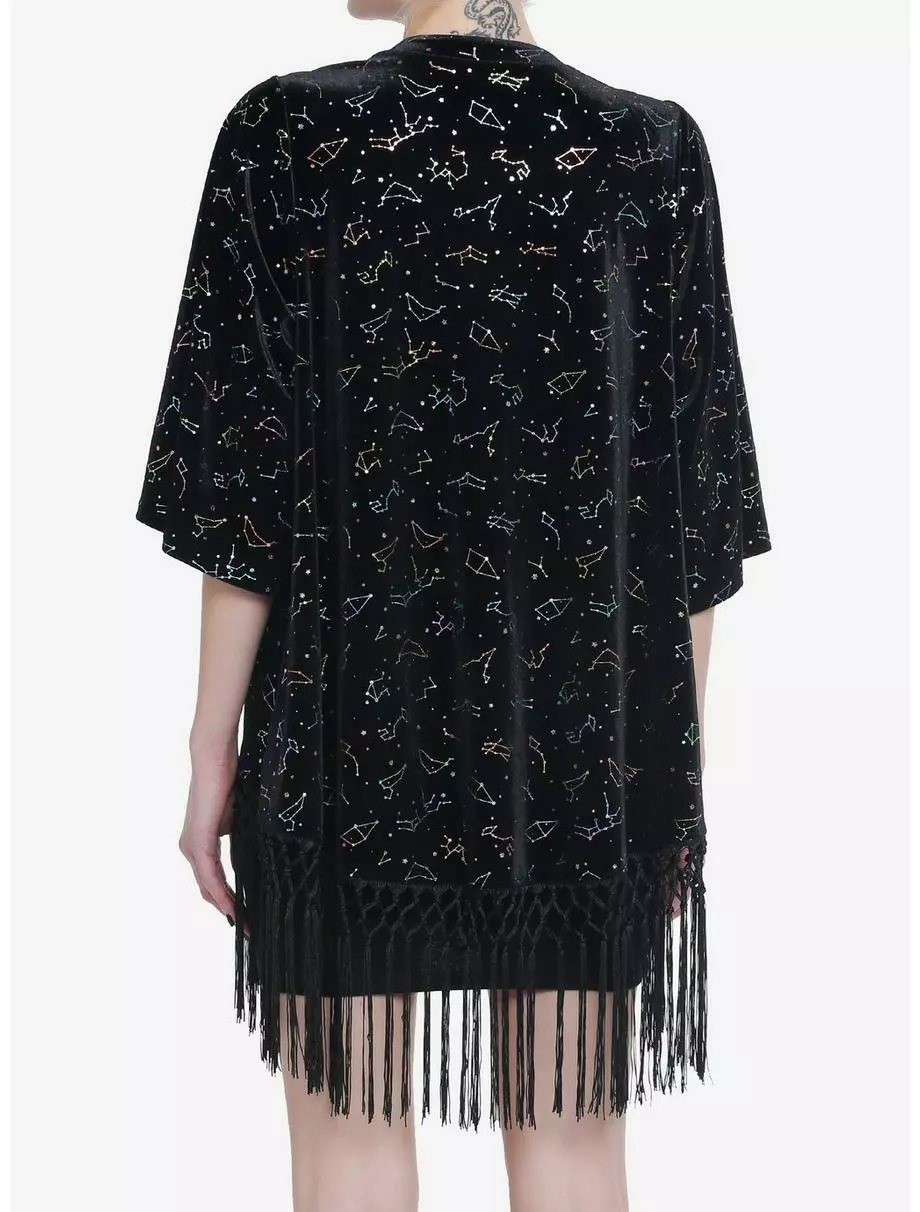 No need to look to the stars for your next statement-making piece. This velvet duster brings some drama with its extended fringe and a pretty allover print of iridescent rainbow constellations.