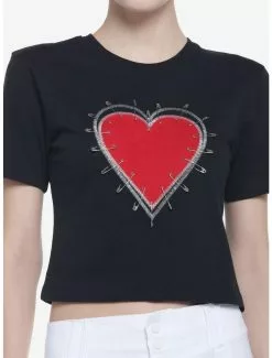 We’ve all had our hearts broken! Sometimes it feels like they’ve been put back together with safety pins and thread. This cropped tee shows an appliqué heart with stitching around it and safety pin detail.