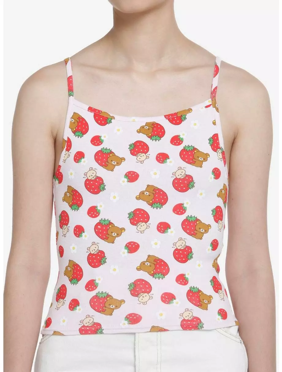 Feel as sweet as a strawberry in this cute cami tank top featuring an allover print of Rilakkuma, flowers and strawberries.