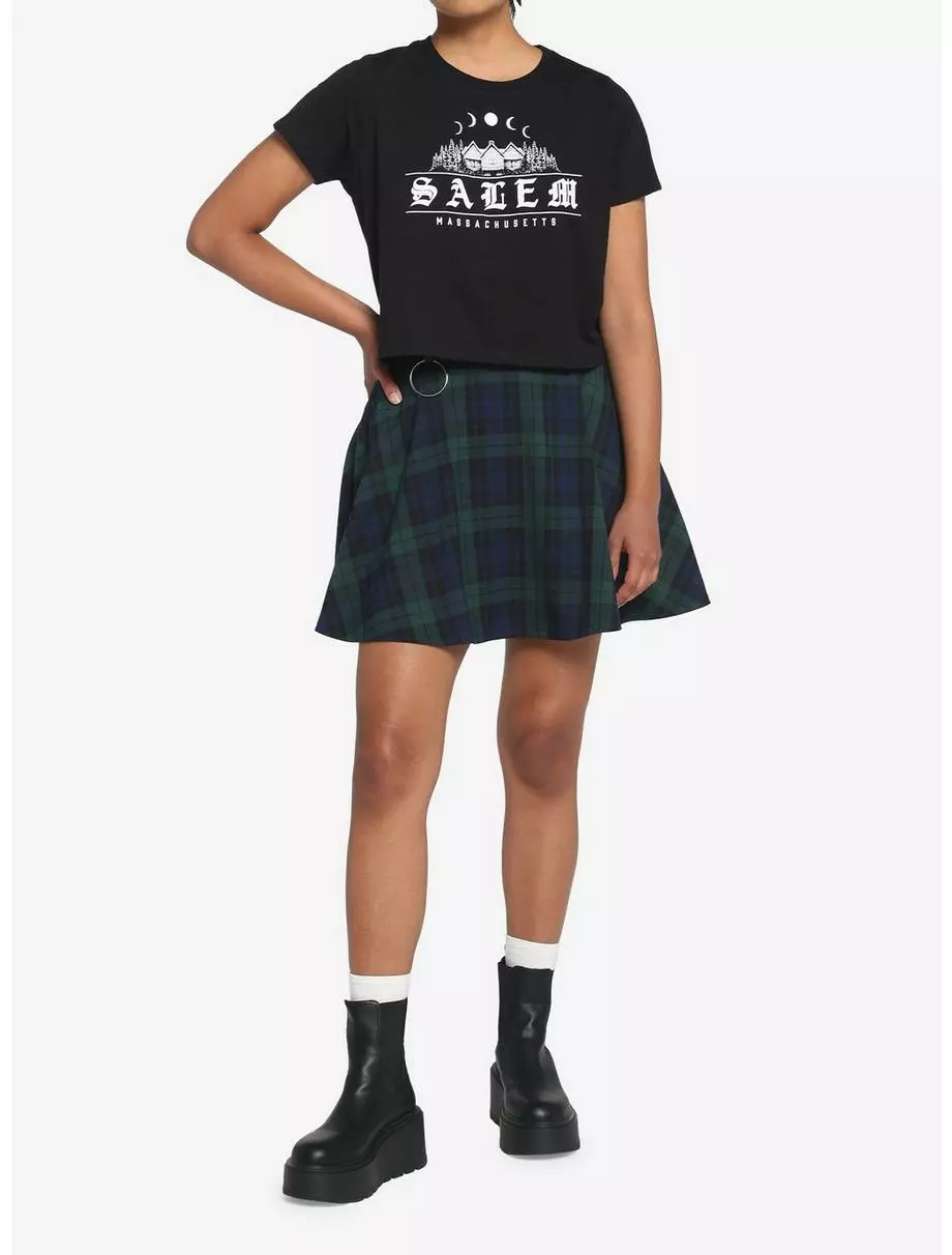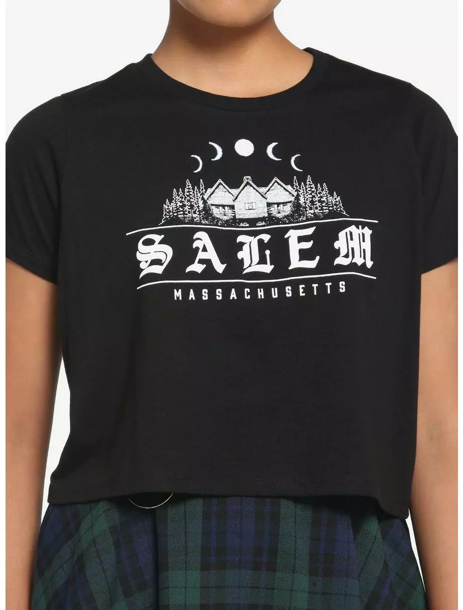 Step into Salem with a spooktacular tee! No witchcraft involved, we promise. Bring some Halloween vibes to your wardrobe with this crop top, featuring the infamous Witch House with the moon phase up top, and “Salem” printed in a bold gothic font with “Massachusetts” underneath.