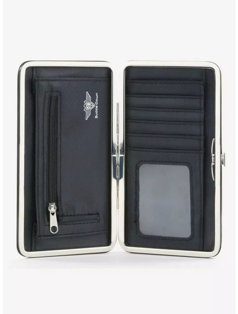Stylish and sleek, this hinged wallet is made from vegan leather and stainless steel. It measures 7 x 4 x 0.75 inches, with 2 billfolds, 4 card slots, and a windowed ID holder.