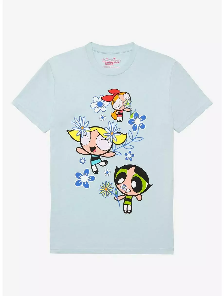 Add some sugar, spice, everything nice and Chemical X to your look with this blue tee featuring Bubbles, Blossom and Buttercup surrounded by flowers.