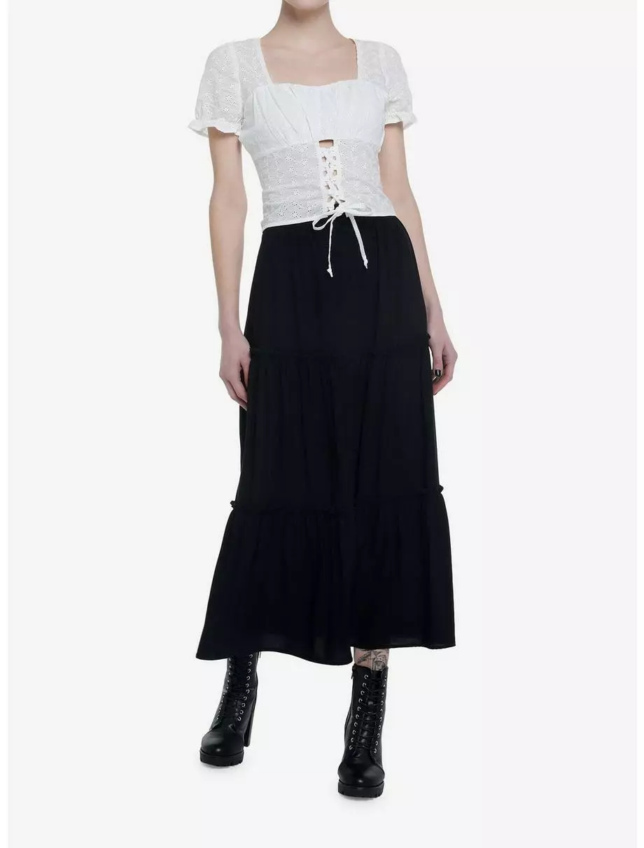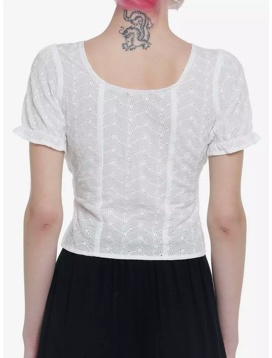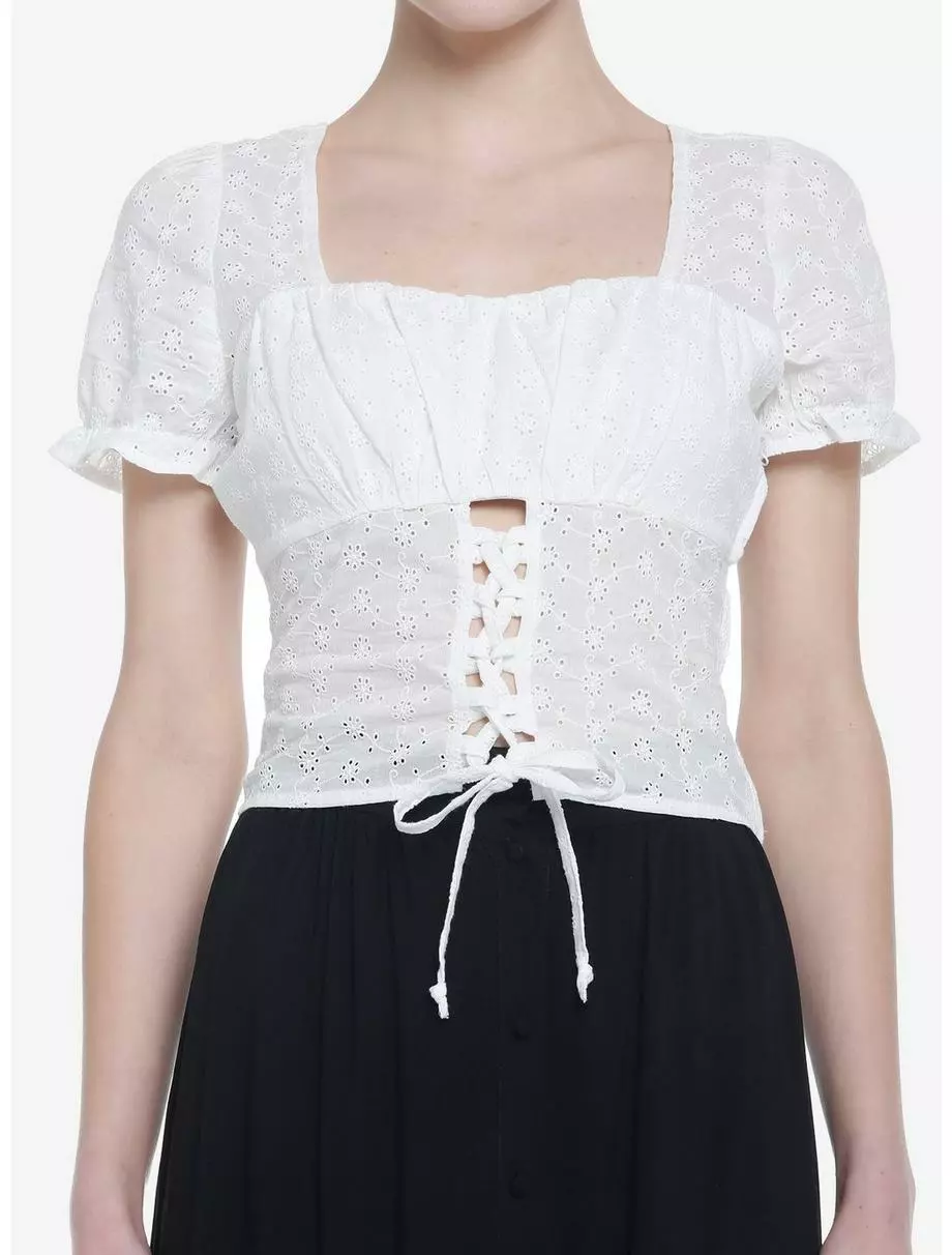 Get ready for spring with this cute and flirty top! It has a cropped fit and features a floral eyelet design through out and ruching at the bust. Comes with lace-up detailing on the front and puff sleeves with ruffle trimming. Complete with a side zipper closure.