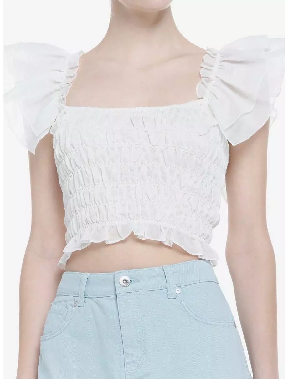 White Smocked Flutter Sleeve Girls Crop Top